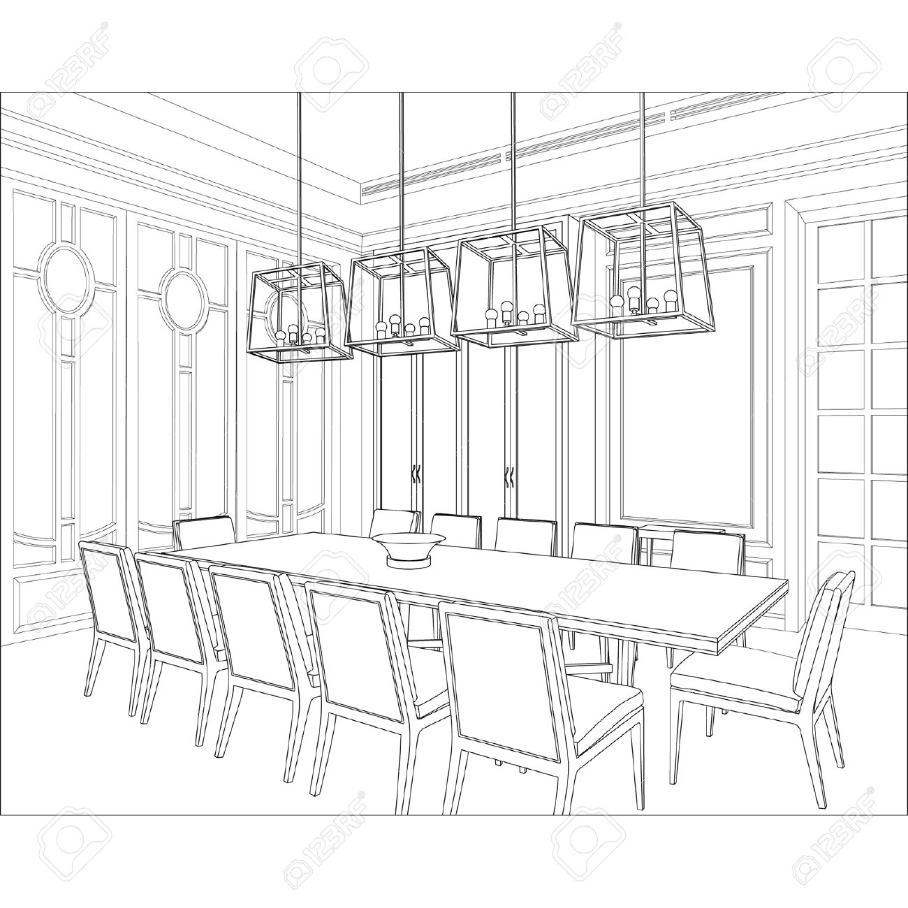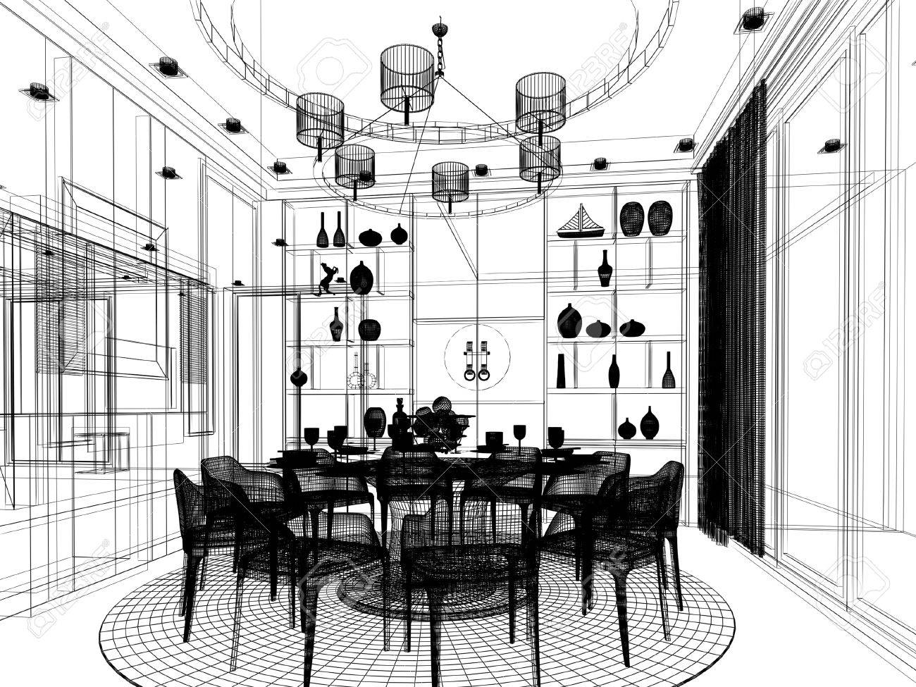 Interior Design With Modern Dining Room In Black Line Sketch On