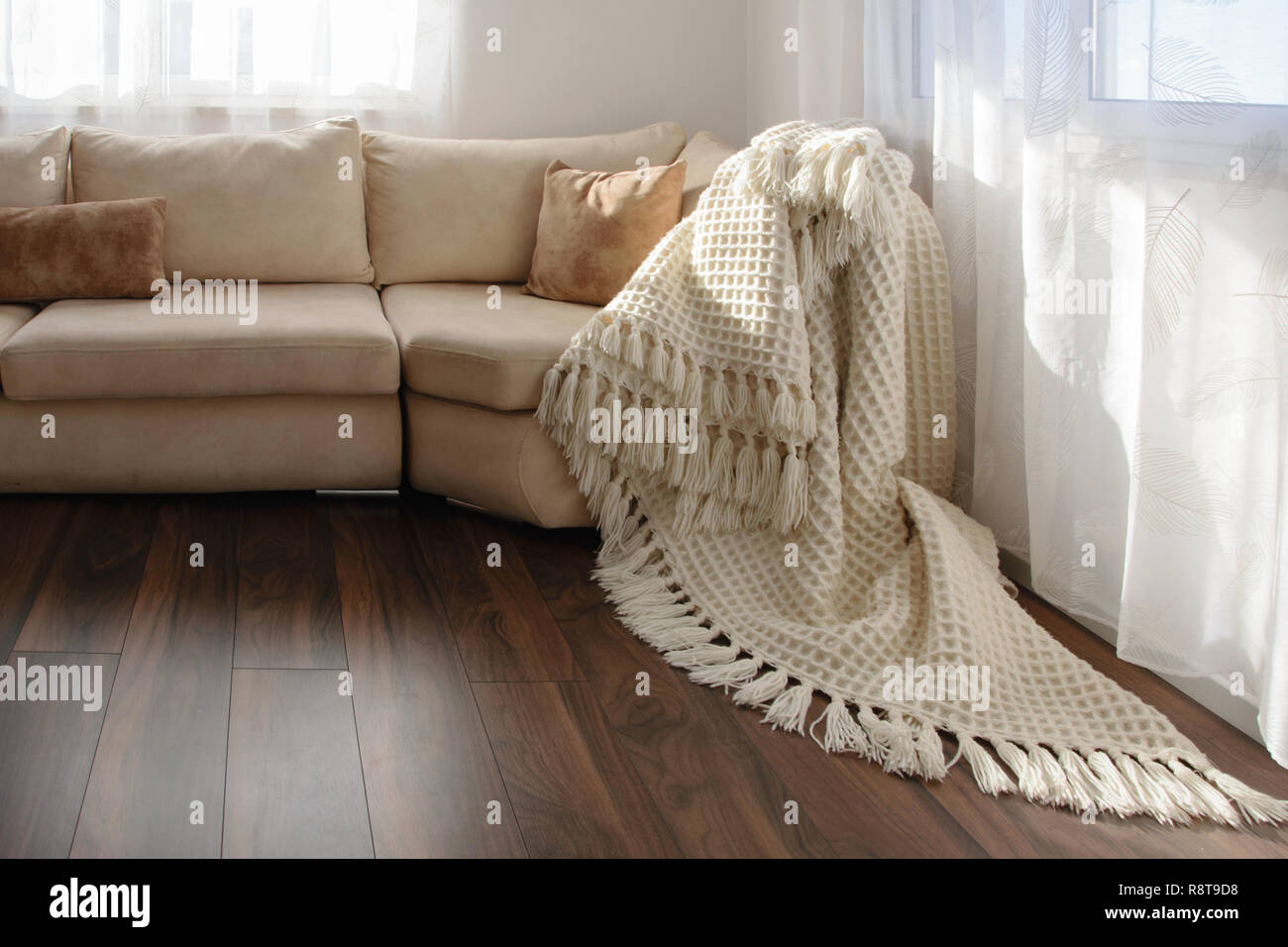 White Handmade Macrame Above Comfortable Beige Living Room Sofa